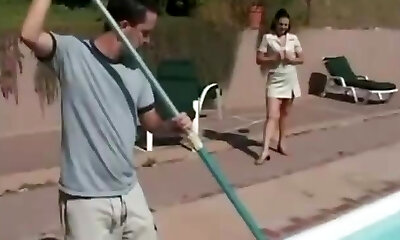 哥伦比亚超级荡妇Ariella Ferrera嘲笑她的游泳池伙计,直到他Jizzes向她内部