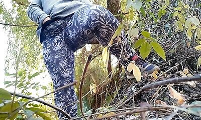 milf curvilínea con vientre de buen tamaño y culo de buen tamaño en pantalones elásticos se masturba al aire libre