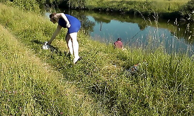 Naughty beach. Sexy Cougar Platinum naked sunbathing on river bank, random fisherman guy watches. Nude in public. Nude beach